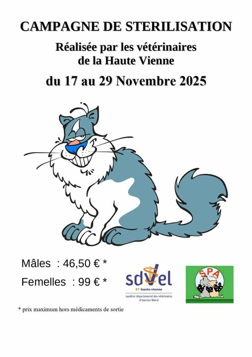 La prochaine campagne de stérilisation des chats et chattes aura lieu du 17 Novembre au 29 Novembre 2025.